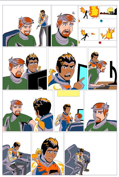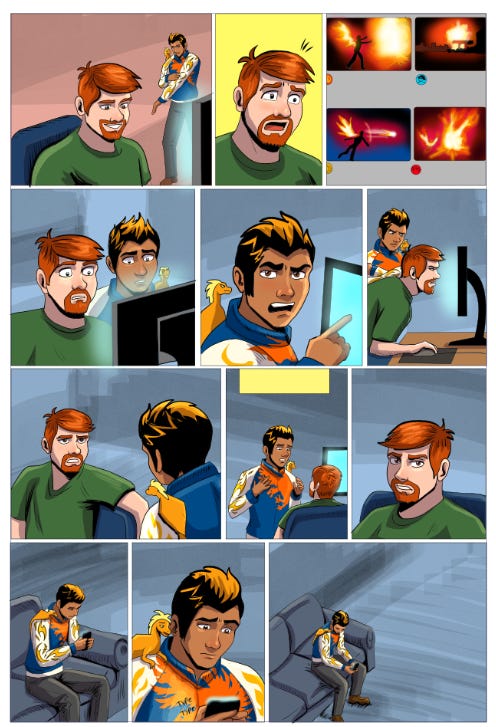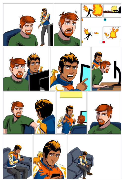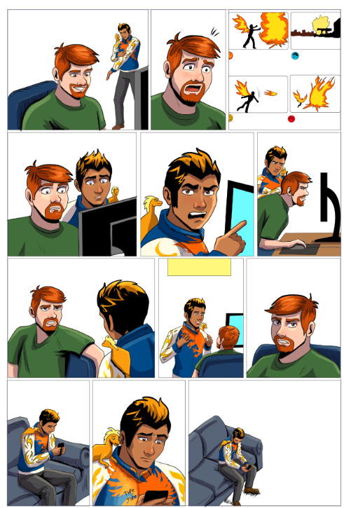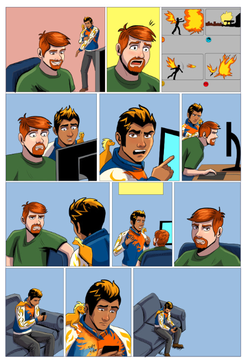 Jayesh’s outfit is a bit more complex in this page. I imported a graphic for his shirt, clipped that layer to the color flats layer, erased the bits that overlapped areas I didn’t want, then merged the layer into the color layer so I could put shading on it. Not all characters will need this much detail, but sometimes you just need it.